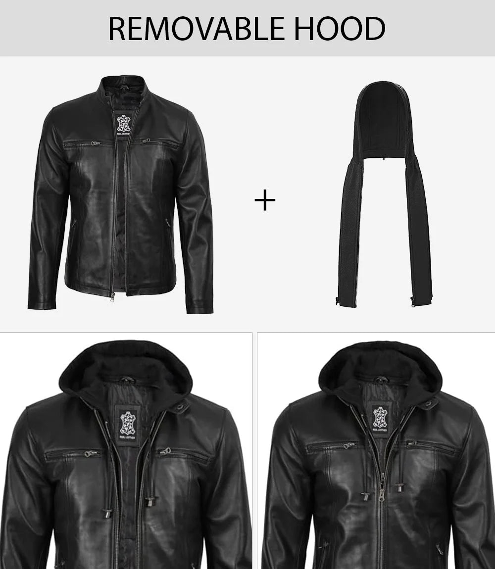 Jonathan Mens Black Cafe Racer Style Leather Jacket with Removable Hood