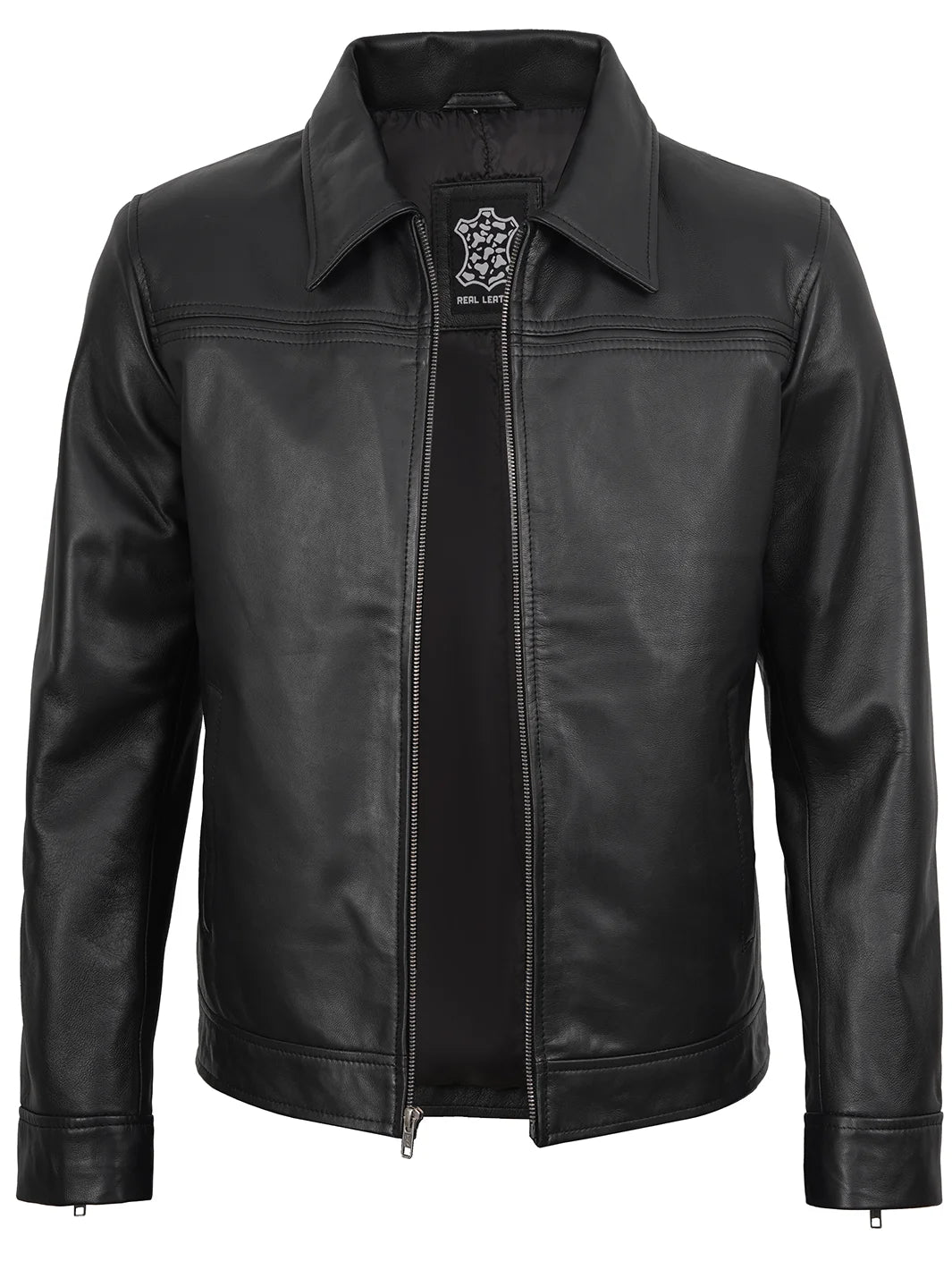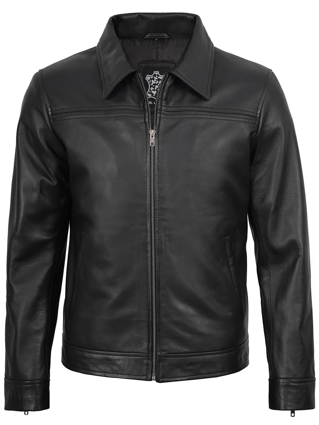 Klassische schwarze Herren-Lederjacke aus Lammleder mit elegantem Hemdkragen und zuverlässigem Reißverschluss. Mit praktischen Außentaschen und einer taillierten Passform, die sowohl für Freizeit als auch für Abendveranstaltungen geeignet ist.
