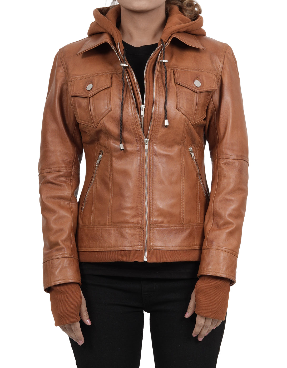 Werten Sie Ihre Garderobe mit unserer Damen-Bomberjacke aus hellbraunem Wachsleder auf. Sorgfältig aus hochwertigem, gewachstem Leder gefertigt, besticht diese Bomberjacke durch ihren eleganten Glanz und ihre lange Haltbarkeit. Die abnehmbare Kapuze sorgt für Vielseitigkeit und ist perfekt für jeden Anlass.